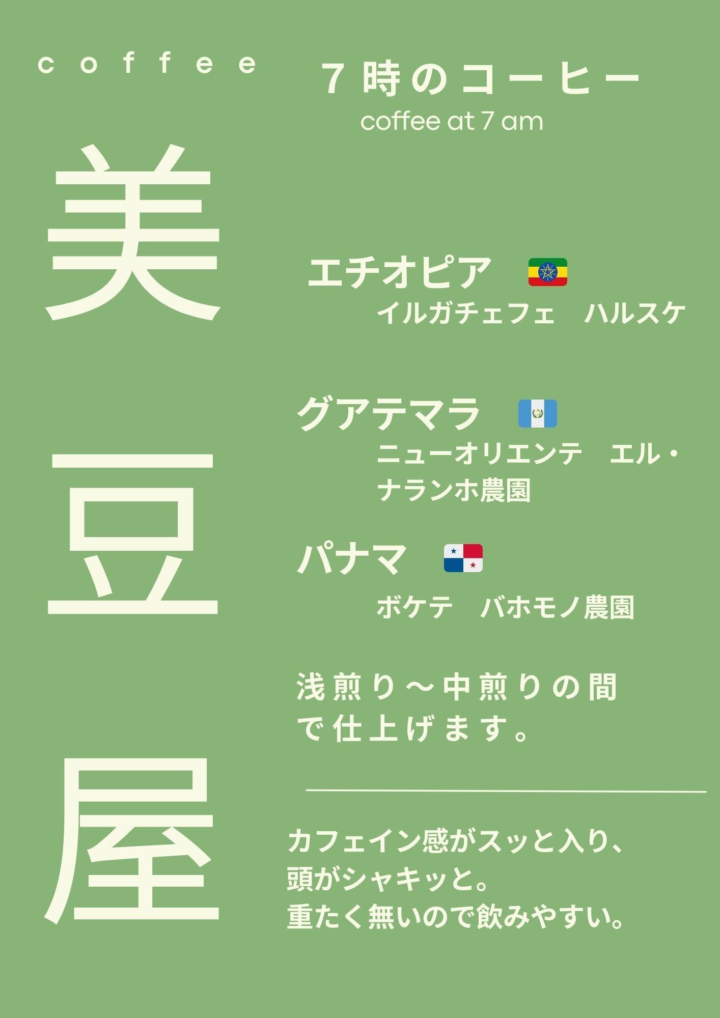 朝の始まりにぴったりな「7時のコーヒー」。このコーヒーは、忙しい朝の時間に合わせて絶妙な焙煎具合で仕上げられています。軽め爽やかが特徴で出勤や家事の合間、一日のスタートにふさわしい活力を与えます。毎朝の儀式を特別なものにするための豆です。
